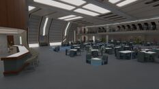 The Mackenzie's Officer Mess is on Deck 1 for bridge and senior staff only. There's a cook assigned to the room and it is designed to be a place for the senior staff and bridge crew to wind down or simply relax. The large windows give a good view of the stars and it is generally a quiet place for study, relaxation, or a quiet game at one of the tables
