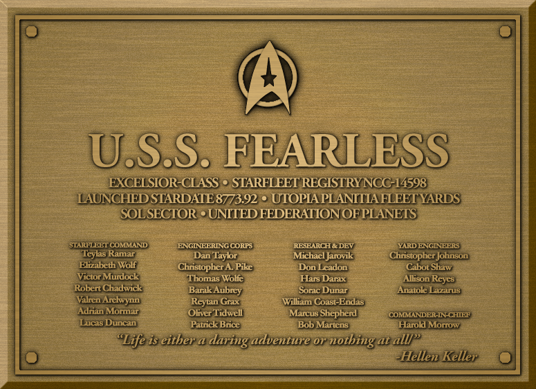 The USS Fearless, was one of several original Excelsior-class heavy cruisers still on active duty by the turn of the 23rd century. Still considered a staple starship of the fleet, capable of holding their own in galactic theater, the remaining Excelsior and Refit variations were marked for overhaul and conversion to Excelsior II-class specifications. The Fearless was the last to be converted after most were completed by 2399. To honor the unique evolution of the Fearless, a new registry number was assigned but no letters were given to mark a new class or vessel to carry the name. As a result, the ship displays two dedication plaques from both its original commission and that of its recommissioning in 2401.