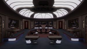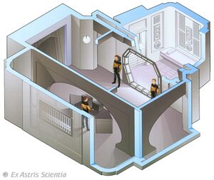 The aft alcove to the port side of the bridge includes two doors. One is used for turbolift access, while the other is access to bathroom facilities. In the aft alcove to the starboard side is a door leading down the corridor towards the observation lounge and another for the second turbolift. In the forward starboard alcove, one entry gives access to the emergency turbolift to the battle bridge, while on the opposite side, it gives access to the captain’s ready room.