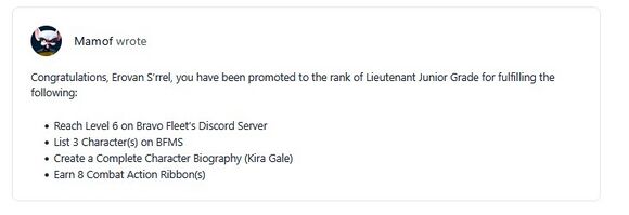 Considering everything mentioned above and his time in grade, we are delighted to promote MEMBER Y to the rank of Commander and commence the next chapter of his journey in Bravo Fleet. We are excited to see him earn more awards and write on a new ship now that he has become a Commander!