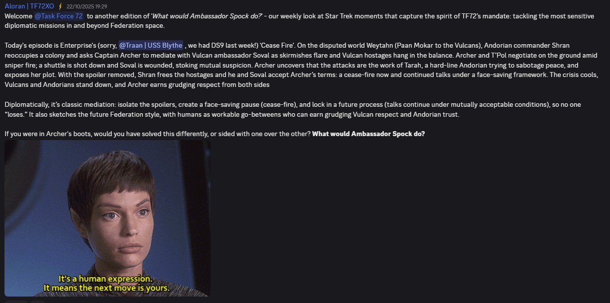 A thoughtful discussion format: present a moral or strategic dilemma — ideally based on a Star Trek episode — and ask members how they would solve it.