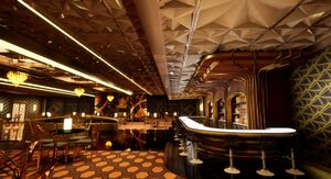 The Hamilton lounge feels like a classic hotel bar carefully adapted for life in space. Nestled in the heart of the Victory, the lounge is a long, low room with deep reds, dark metals, and soft gold accents that give it a warm, inviting glow. The walls are broken up by clean geometric panels and subtle inlays of starfields, ships, and Federation emblems, so the decor reflects space travel without overwhelming the eye. A bright, polished bar stretches almost the length of the room, backed by lit shelves of real and replicated bottles, with a neat row of stools where crew and their guests can sit and talk. Overhead, the ceiling is divided into shallow coffers and structural ribs with recessed lighting instead of harsh strips, keeping the atmosphere low and comfortable. Patterned carpeting softens the deck plating underfoot, and curved banquettes, small tables, and a compact grand piano near one end complete the layout. The result feels less like the polished meetal of the rest of the ship and more an ambience of warmth and colour.